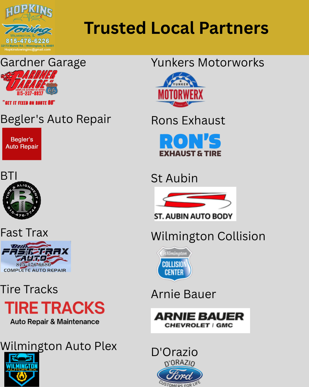 Hopkins Towing, Inc., is a family-owned and operated business based out of the old Browns Towing yard in Wilmington, IL. Carrying on the classic Browns Towing phone number that has been around since 1962! We strive to offer the same friendly, reliable and dependable service as Browns Towing did for many years! We offer local and long-distance towing for vehicles including motorcycles, classic cars, campers, trailers, boats as well as lockouts, jump starts, tire change, and emergency roadside service 24-hours a day 7 days a week. We service Wilmington, Braidwood, Coal City, Diamond, Channahon, Braceville, Gardner and surrounding areas. We can't wait to serve you! As always call 815-476-6226 for your towing needs.